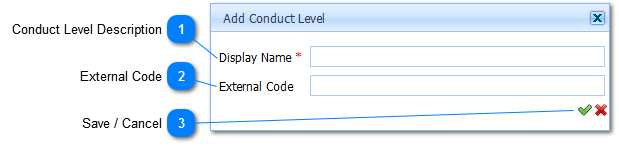 The Display Name is a Required field (). The user needs to enter a Description for the Conduct Level. Should the user not enter a Display Name and attempts to Save () the information the system will give an indication () that this is compulsory information.