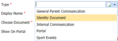 The Document Type is a Required field (). The user selects the Document Type by Left Clicking on the Drop Down List Box (). When this is done a list of available Document Types will be displayed.