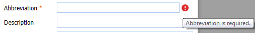 The Abbreviation for the Symbol is a Required field ().  The user can enter a Numeric or Alpha Numeric Value for the Abbreviation. Should the user not enter an Abbreviation and attempts to Save () the information the system will give an indication () that this is compulsory information.